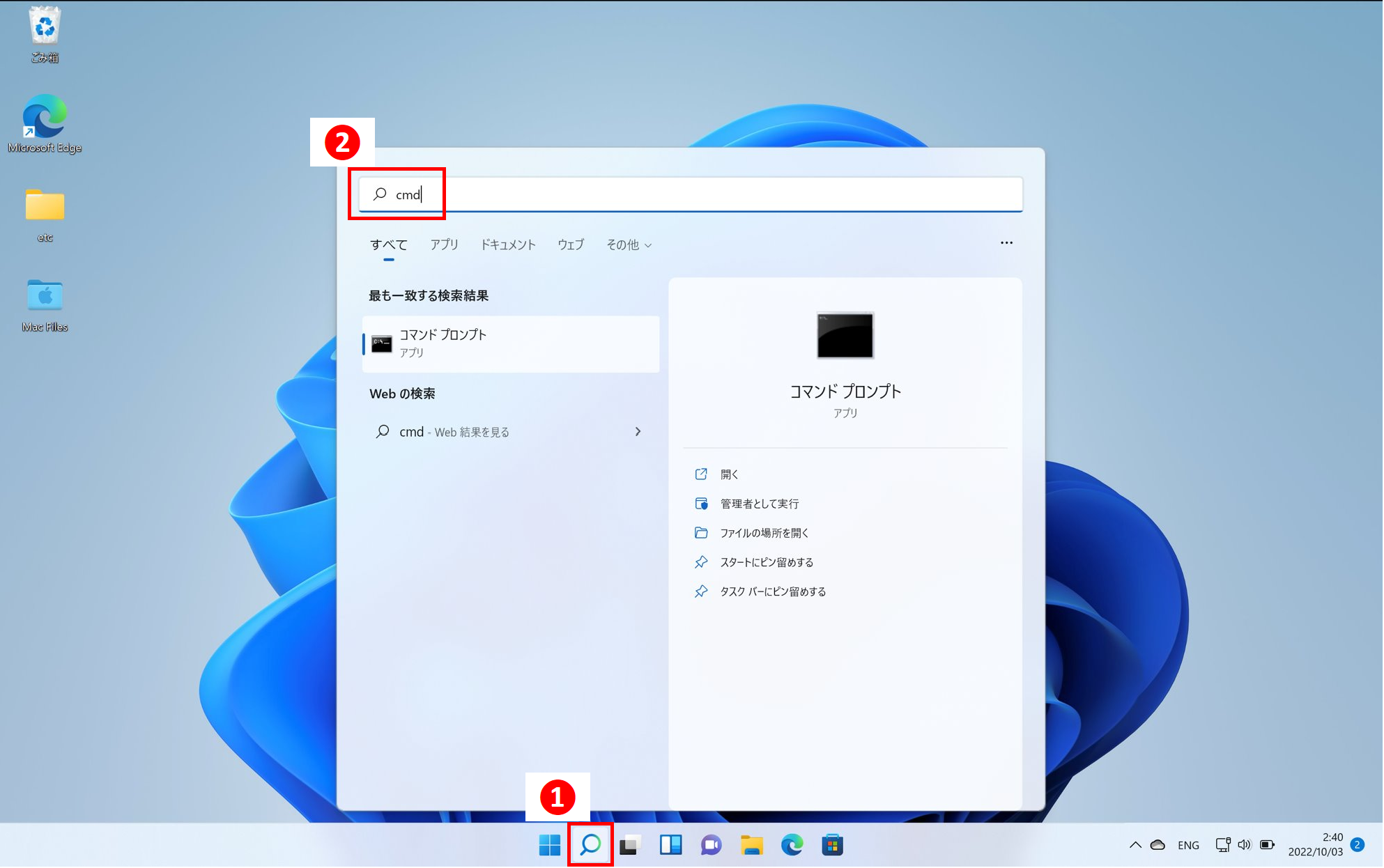 ❶タスクバーから虫眼鏡を左クリックします。❷下記を入力します。