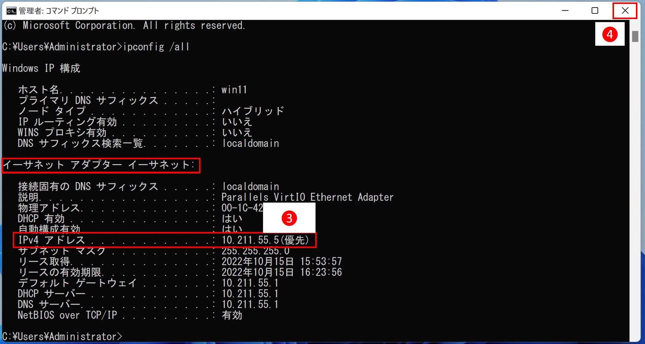 ❸IPアドレスを確認します。